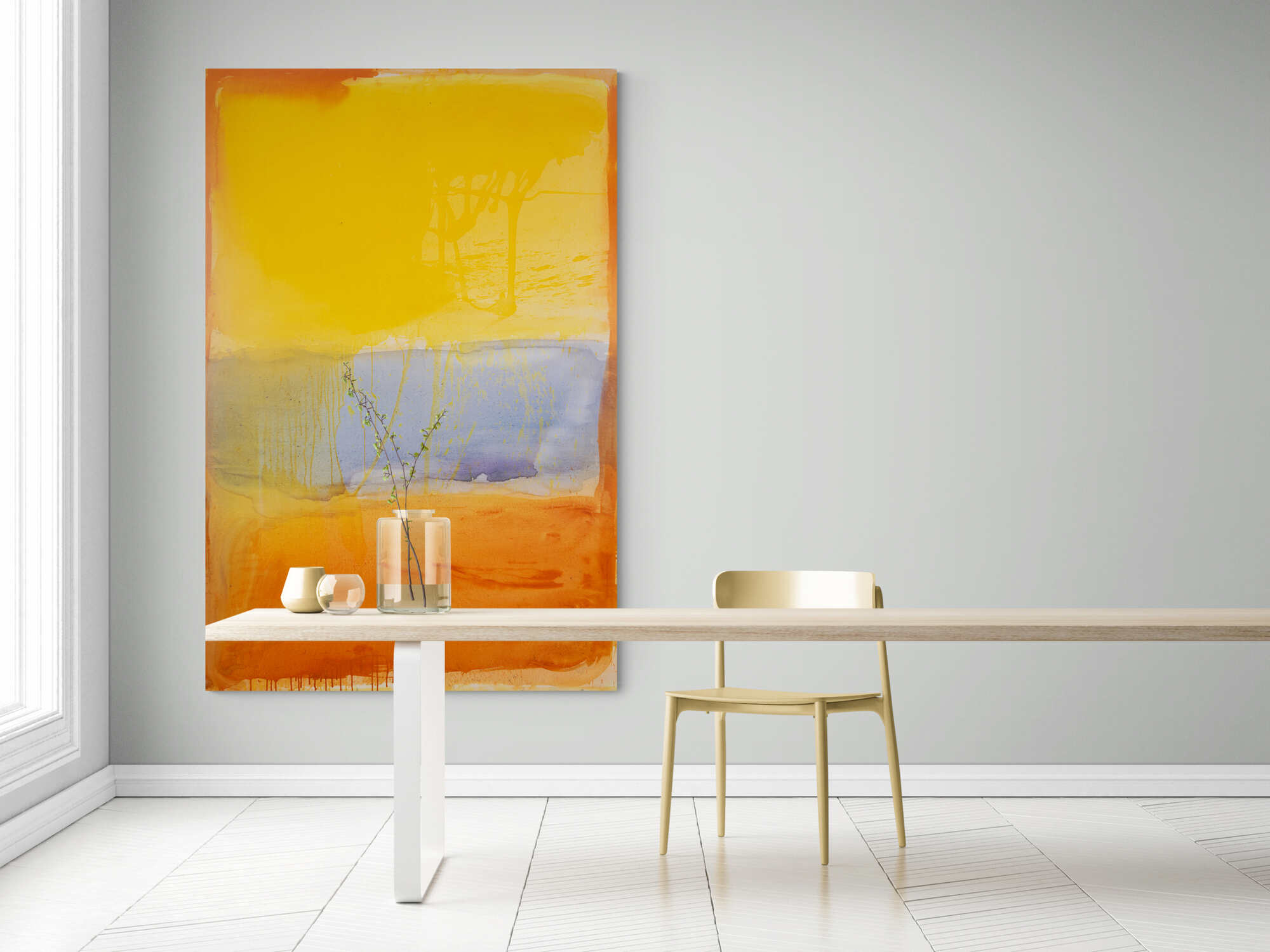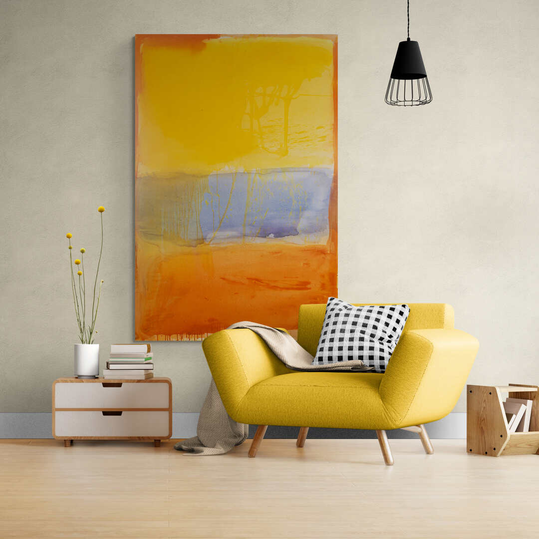 The top field of golden light evokes clarity, hope, and the illumination that comes from choosing joy—even in uncertainty. The cooler band of blue represents the reflective space of stillness, intuition, and the soul’s quiet voice. The deep orange base anchors the work, reminding us of the strength we find when we root ourselves in truth, passion, and creative fire.