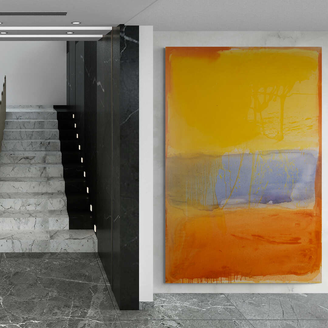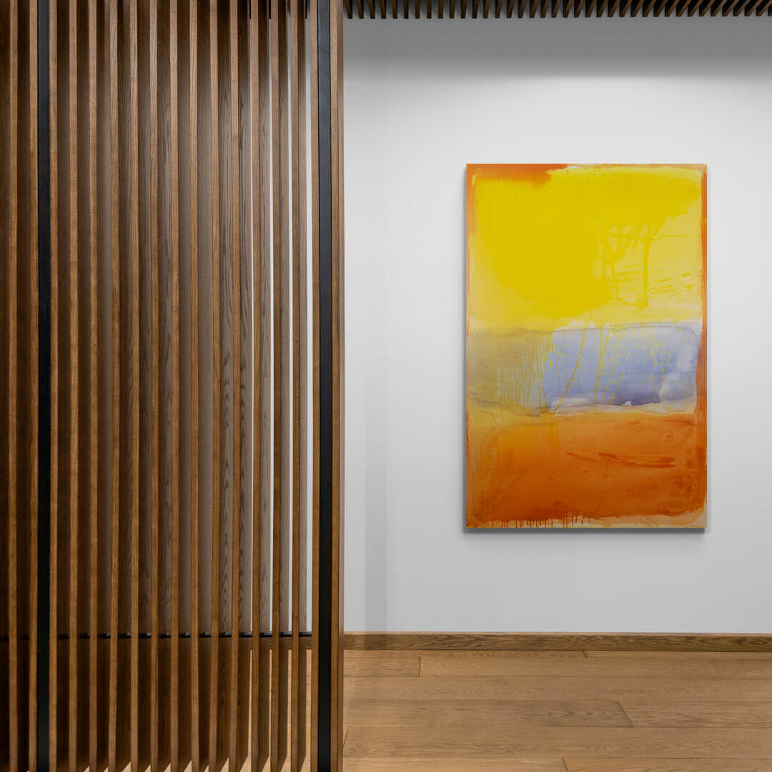Flow, is one of my most joyous creations and, at the time, one of the first large colour field paintings I ever created. It was some 20 years ago now. I still remember painting this outside on the grass at the farm, en plein air. My grandmother and later my father lived on the property before he passed. My grandmother bred horses for a living, and I recall around six of them standing around the painting as I washed fields of colour. It was a magical time, a memory I still hold in my heart. I reached out to my friend and muse, Max Gimblett, for some wisdom when embarking on this new fluid style. Max is a Zen Buddhist Monk and fellow artist, and one of the only New Zealand artists to have exhibited at the Guggenheim in New York. I asked him, “How do you know when you’re finished?”