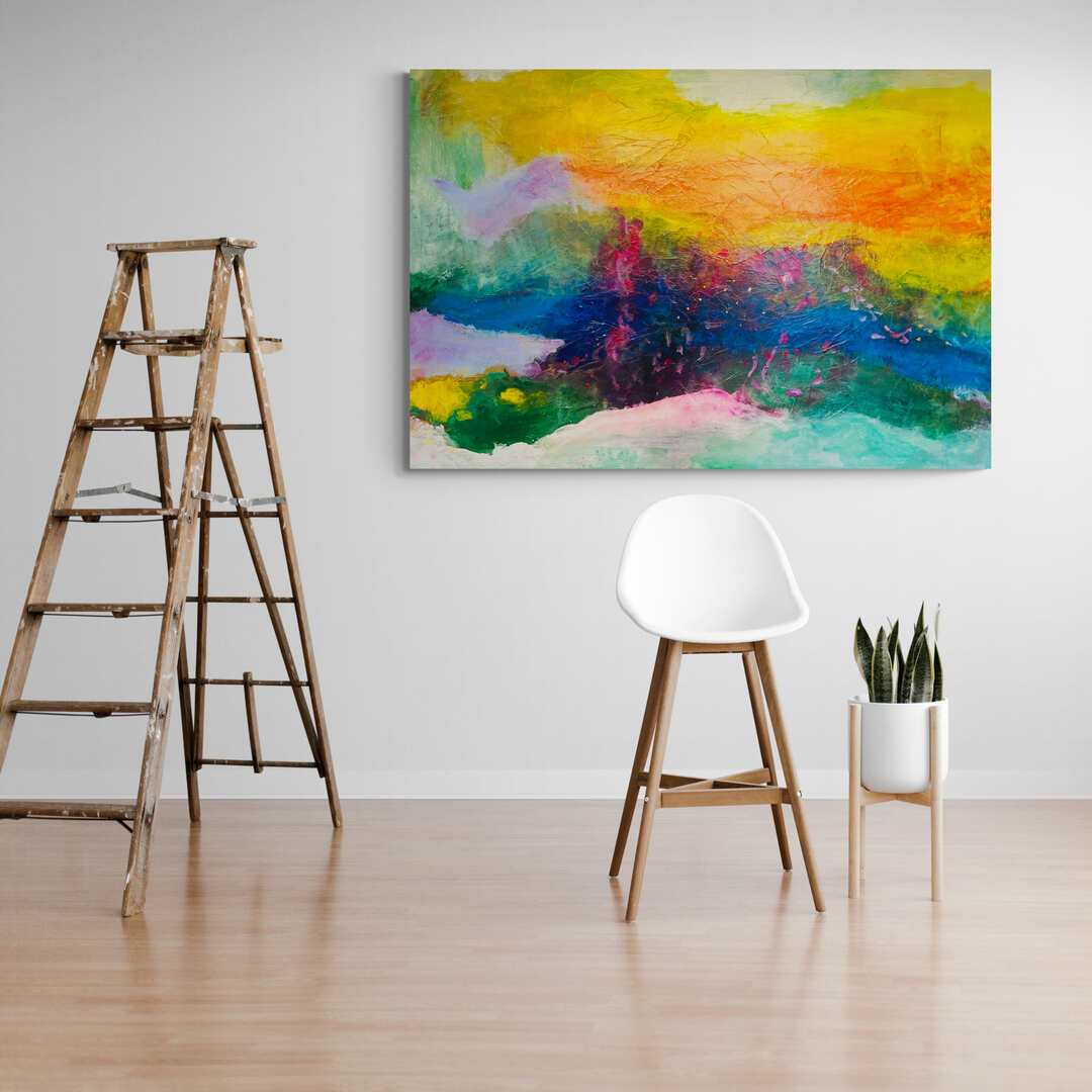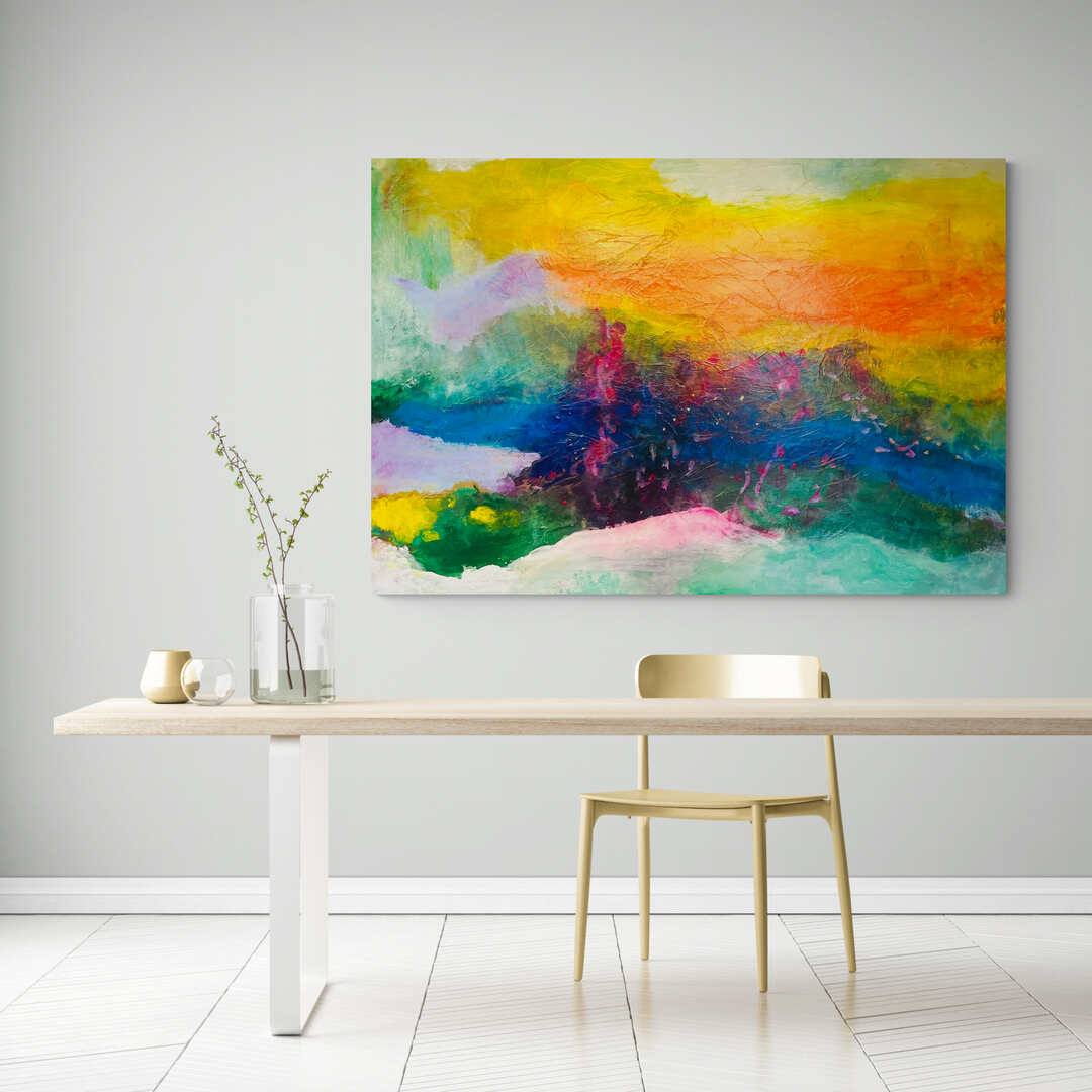 Beautifully layered with sensuously sultry glazes of acrylic, Fun! Fun! Fun embodies the high-vibe energy of flow, optimism, happiness and joy that our souls ache for after the tumultuous, confining past years of Covid lockdowns. The painting was completed during one of the worst New Zealand summers on record, particularly wet and stormy days as driving rain pummeled the studio. In the ‘landscape of my mind’ I looked to rays of sunshine, bright rainbows stretching across the sky, brilliant shades of flowers. Each touch of colour brightens our day and hints of fresh promise. Colour brings with it an intrinsic, uplifting sense of hope and optimism—and yes, fun!