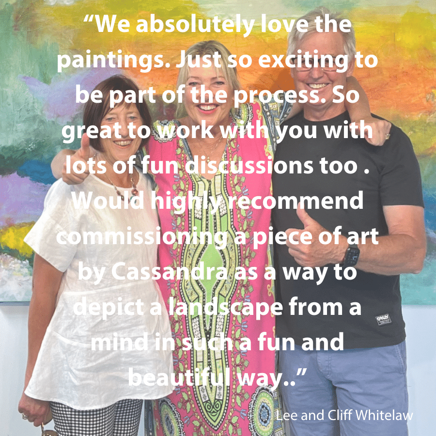 We absolutely love the paintings. Just so exciting to be part of the process . So great to work with you with lots of fun discussions too . “Would highly recommend commissioning a piece of art by Cassandra as a way to depict a landscape from a mind in such a fun and beautiful way.” ~ Lee and Cliff Whitelaw (Commissioning clients)