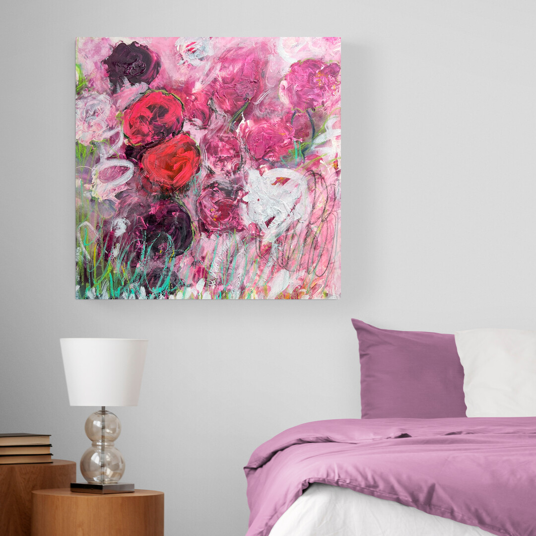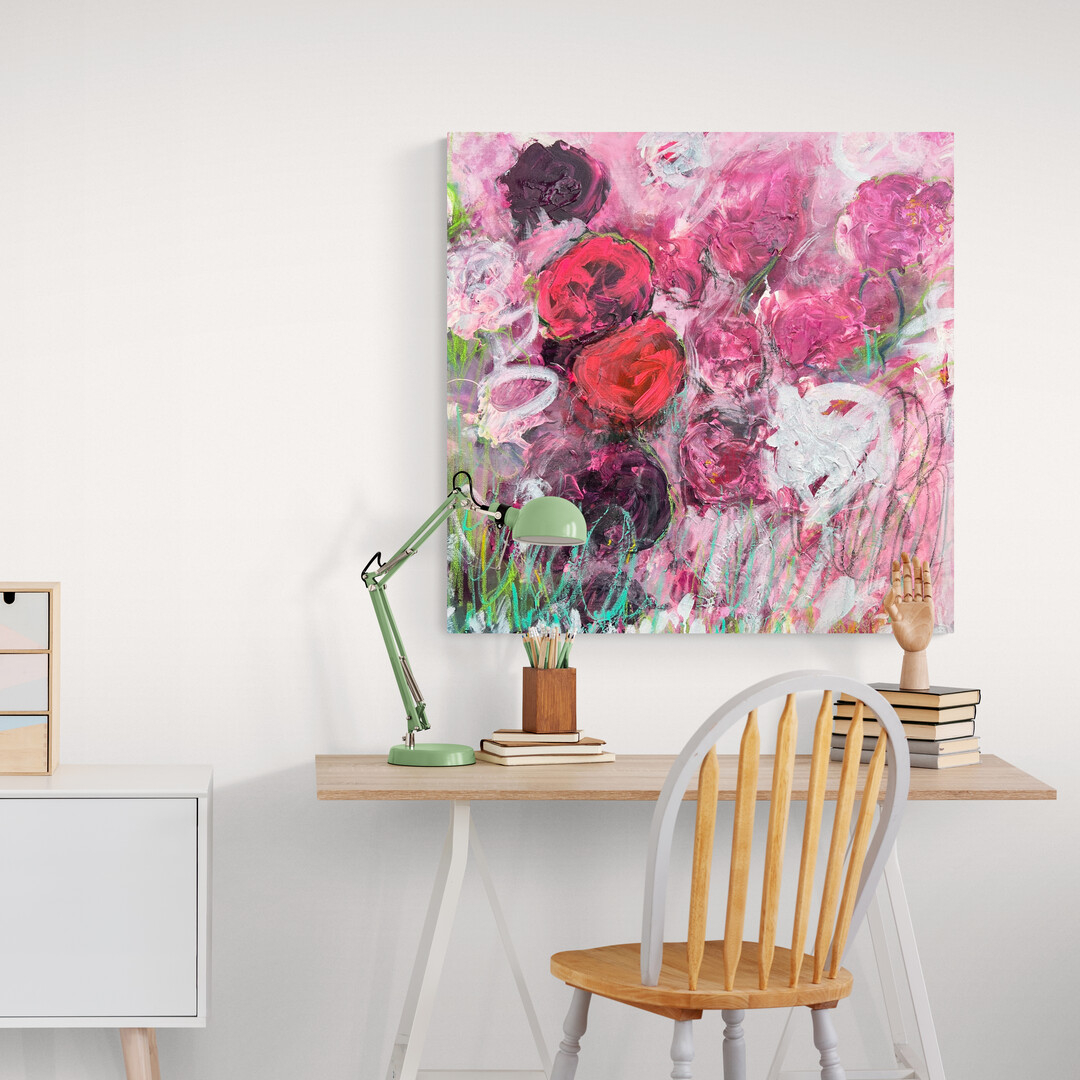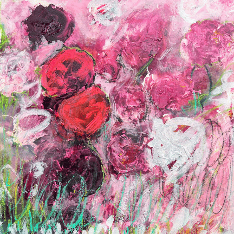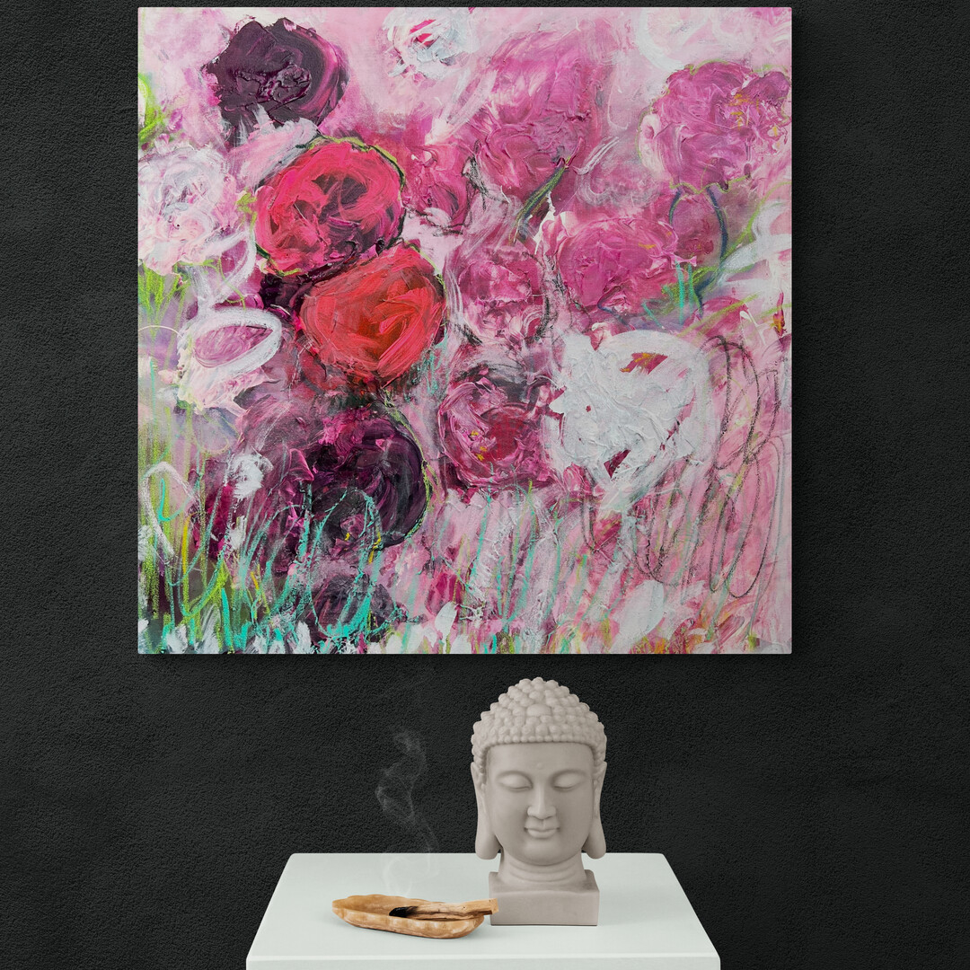 Seductive, sensuous pinks are employed pamper, soothe and delight. Playful, spontaneous, and gestural strokes imbue this painting with life.