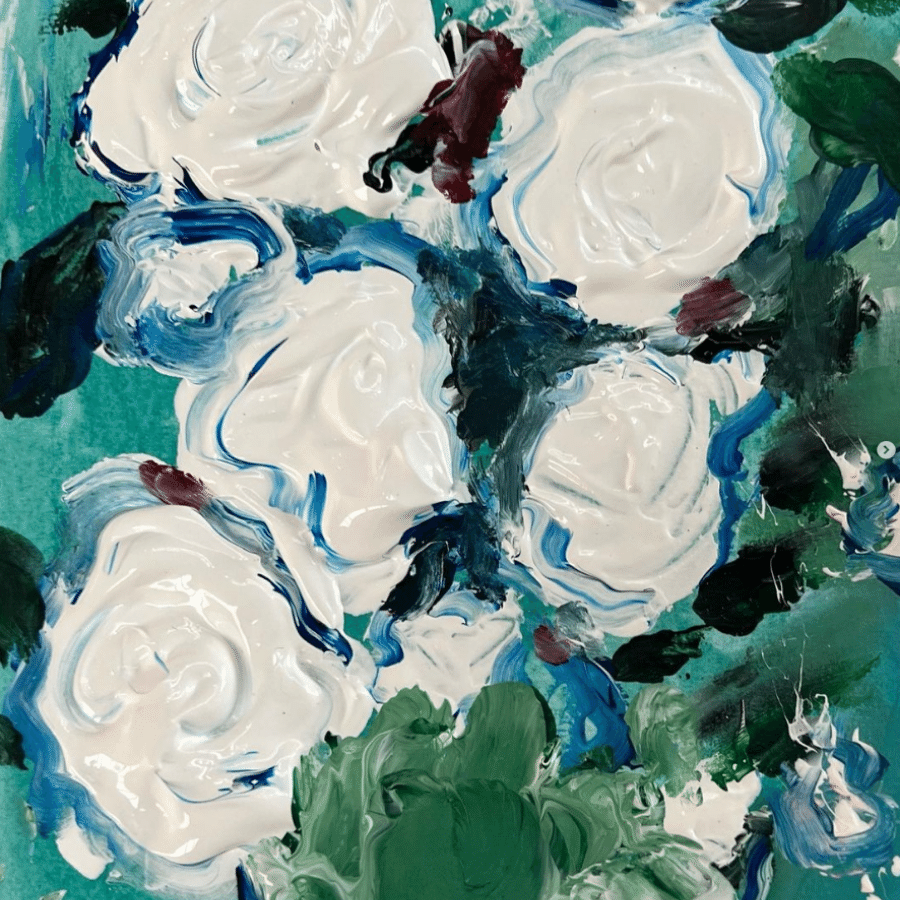 Roses: Ode to Vincent van Gogh is an abstract floral painting from my new Joyous Wee Gems collection. Layered in sultry, juicy globs of love-infused acrylic on a bed of peaceful green.